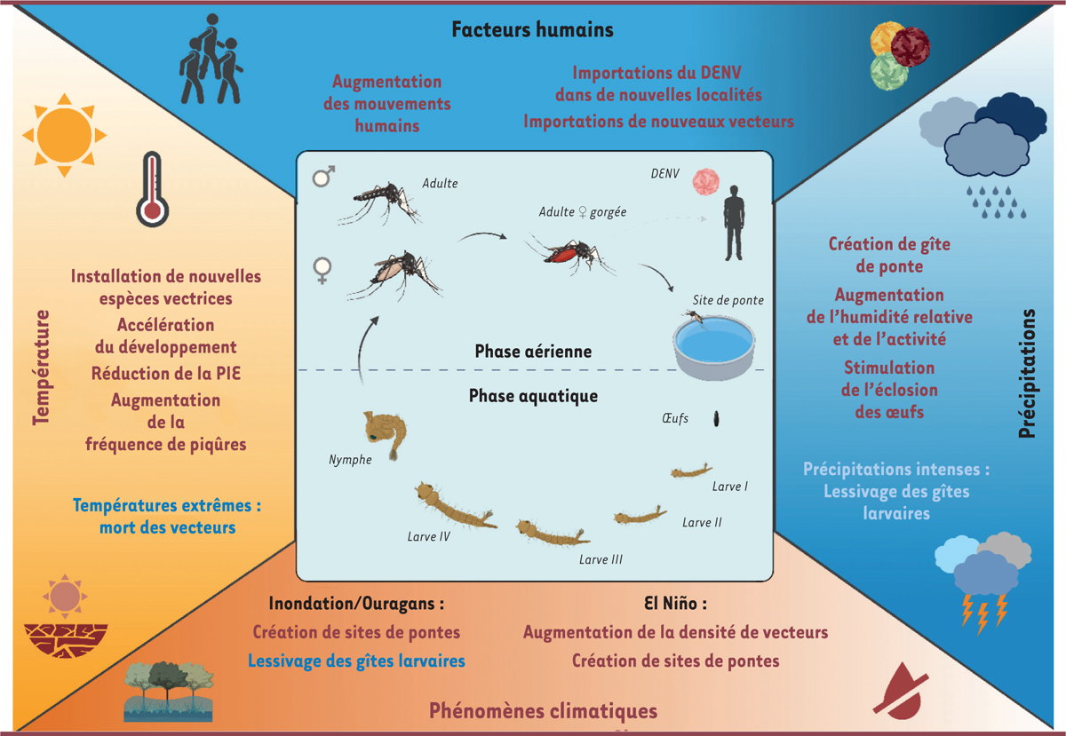 . Au cours des dernières décennies, la dengue est devenue une préoccupation majeure en raison de sa propagation rapide et de son impact significatif sur la santé publique. Le changement climatique est reconnu comme un facteur majeur de l’expansion géographique de la dengue et de ses vecteurs. Le changement climatique influence la transmission de la dengue